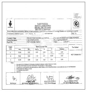 IN PAKISTAN LABORATORY HOWEVER THE PERCENTAGE OF CACO3 AND SIO2 IS SLIGHTLY VARIABLE ACCORDING TO DIFFERENT MINING PLACE. SO PLEASE FIND IT ACCEPTABLE.